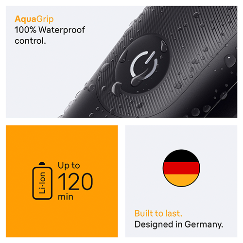100% waterproof grip, up to 120 mins runtime, and engineered in Germany for lasting durability and control.