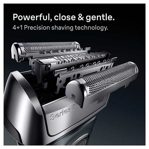 The Series 8's 4+1 synchronised shaving elements work seamlessly to deliver a close and gentle shave in every stroke, while minimising skin irritation and maximising efficiency