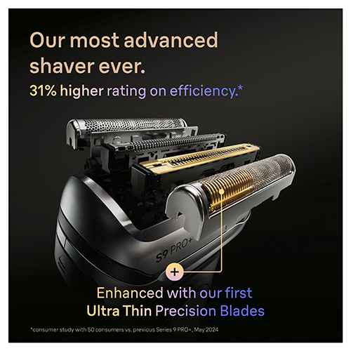 Experience top-level performance with The Braun Series 9 PRO+. Engineered for the closest, most comfortable shave, it features 5+1 perfectly synchronised shaving elements that effortlessly cut through tough and dense beard hair in a single stroke. Ideal for sensitive skin, the ultra-thin precision blades minimise pressure and irritation for exceptional skin comfort.