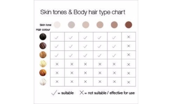 Not suited to very dark skin, or to treat red, light blonde or white/grey hair. For added safety, built-in sensors ensure the device never fires on an unsuitable skin tone.